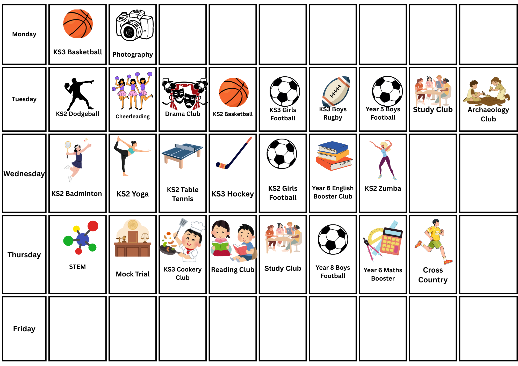 Please see our Spring term timetable below. If you are interested in any clubs, please speak with the club lead.
