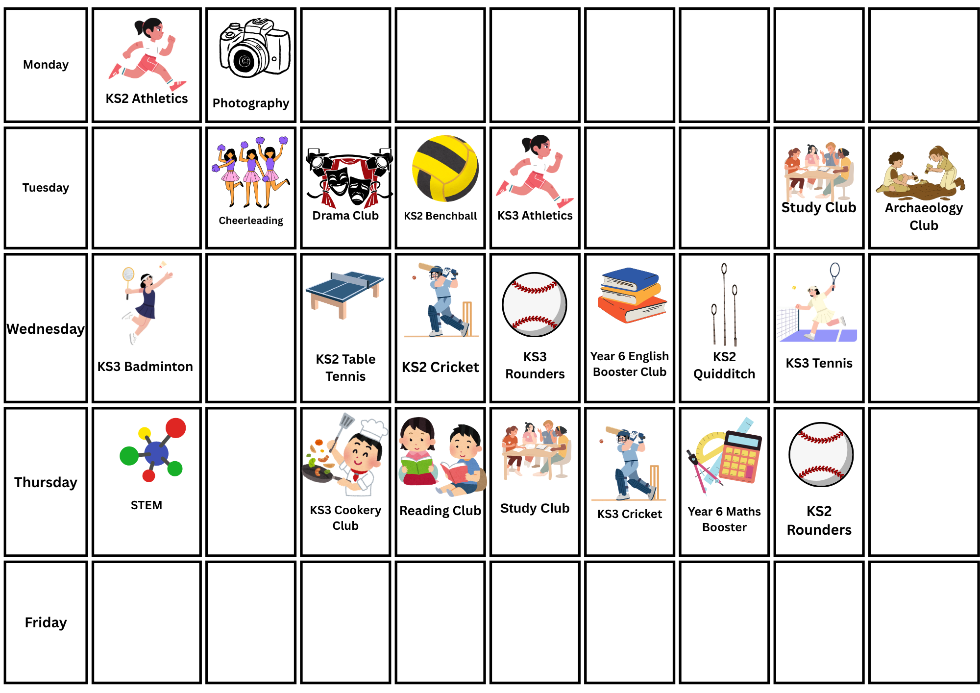 Please see our Summer term timetable below. If you are interested in any clubs, please speak with the club lead.