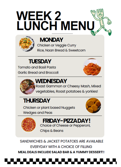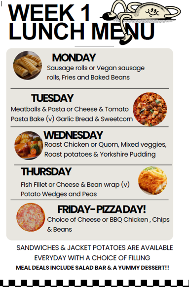 Our school menu offers a wide variety of nutritious meals to suit all tastes and dietary needs. Each day, students can choose from a selection of hot and cold options, including freshly prepared dishes, healthy snacks, and vegetarian choices. We are committed to providing balanced meals that support student wellbeing and promote healthy eating habits.
